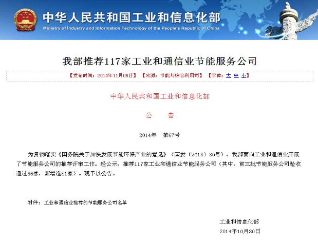 2014年11月4日,國家工業和信息化部發布了關于全國117工業和通信業節能服務公司推薦名單的公告,我公司憑借在節能服務領域的良好業績,成功入選。這標志著公司的技術服務能力得到權威部門及業界的認可為公司的進一步發展奠定了良好的基礎。