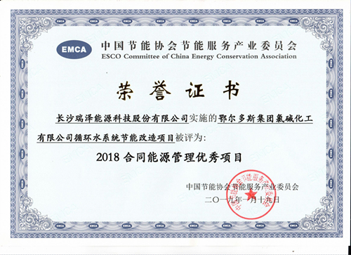 瑞澤能源能源在2018年節(jié)能服務(wù)行業(yè)的出色表現(xiàn)再度榮獲“2018節(jié)能服務(wù)產(chǎn)業(yè)重合同守信用企業(yè)”、“2018EMCA優(yōu)秀會員單位”,瑞澤實施改造的“鄂爾多斯集團氯堿化工有限公司循環(huán)水系統(tǒng)節(jié)能改造”項目獲“2018合同能源管理優(yōu)秀項目”獎。