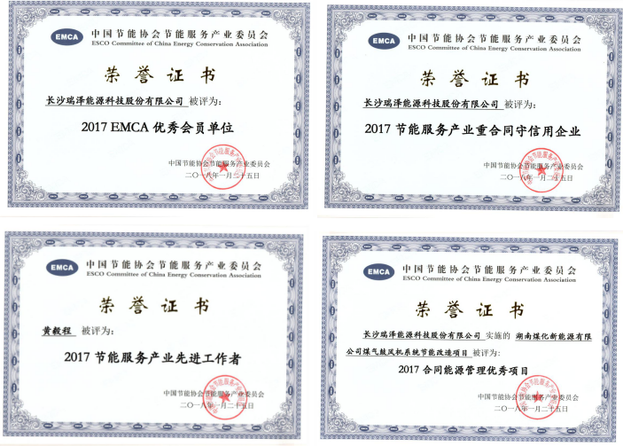 會上,瑞澤能源再次榮獲“2017年度重合同守信用企業”“EMCA優秀會員單位”和“2017合同能源管理優秀示范項目。公司技術總監榮獲“2017年度節能服務產業先進工作者稱號”。