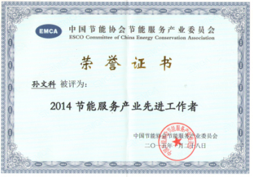 在中國節能協會節能服務產業委員會(EMCA)開展的2014年度節能服務產業評優活動中,我公司總經理榮獲2014年度節能服務產業先進工作者。